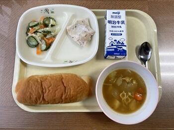 牛乳パン ガーリックチキン フレンチサラダ マカロニカレースープ