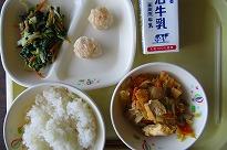 (今日の給食 中華風3品) (青空に国旗がたなびいています)