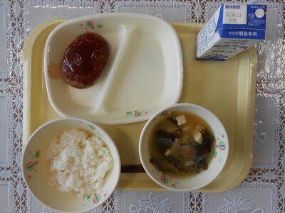 【給食メニュー】ハンバーグ、じゃがいもとわかめの味噌汁です。ハンバーグがとても柔らかく美味しかったです。
