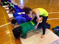 ●バスケット部は、体育館で親も参加して「体幹トレーニング」を行いました。指導者をお呼びし、写真のようなトレーニングをしました。顧問の榎本先生から情報をいただきました。