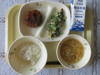 今日の給食は、ご飯、牛乳、カレーコロッケ、ひじきの炒り煮、ゆばとほうれん草のスープです。高根沢町で生産されたものは、大豆、ねぎ、米です。今日もたいへんおいしく頂きました。