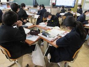 和歌独特の表現方法を押さえながら、古今和歌集の通釈を行っていました。難しい単元だと思いますが、生徒たちは真剣に取り組んでいました。