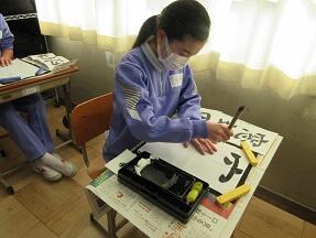 書き初めの「窓辺の花」の「の花」を練習していました。みんな、なかなかの文字を書いていました。