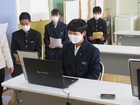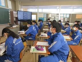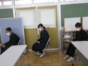今日の朝、全校集会の前に、町長さんと教育長さんが学校を訪問して、3年生の入試を応援するという意味を込めて全校生徒に1人70枚のマスクを配付してくださいました。代表の生徒が受け取りましたが、コロナウイルス感染症が再拡大してきているところで、生徒たちの予防に対する気持ちを高める、たいへんよい機会になりました。