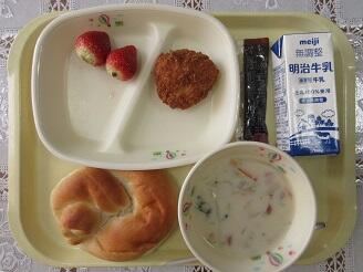 今日の給食は、セルフフルーツサンド(はちみつパン・フルーツクリーム)、牛乳、オムレツ、ミネストローネです。高根沢町で生産された物は、にんじん、玉ねぎ、トマト、大根です。今日もたいへんおいしく頂きました。