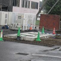 (電柱移動のためのNTT工事) (校舎の囲い 取り外し工事中)