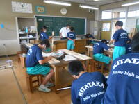 1年3組「技術」木材加工です。それぞれ板に線を引き、のこぎりで加工しています。何ができるか楽しみです。