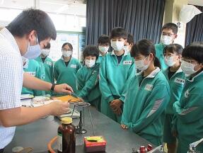 銅を燃焼させて酸化銅になると重さはどうなるかの演示実験を見て、なぜそうなるかを考えていました。生徒たちの実験を観る目が真剣でした。