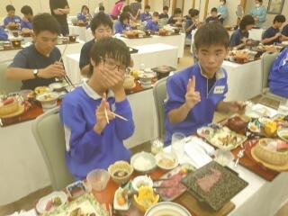 1日目の夕食です。こちらもコロナ感染症予防対策で全員前向きです。みんなおいしそうに食べています。修学旅行では、考えられないくらい豪華なメニューです。