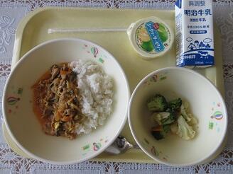 今日の給食は、プルコギ風豚丼(麦ご飯・プルコギ風豚丼の具)、牛乳、ブロッコリーとしめじのサラダ、シークワーサーゼリーです。高根沢町で生産された物は、玉ねぎ、椎茸、米です。今日もたいへんおいしく頂きました。