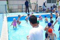年小、年中、年長のクラスに分かれて、生徒たちは朝のお着替えから参加しました。どのクラスも「プール」で水遊びがあったので、生徒たちも園の先生と一緒に園児たちを水着に着替えたり、服に着替えたりなど、汗をかきながら仕事をしていました。
