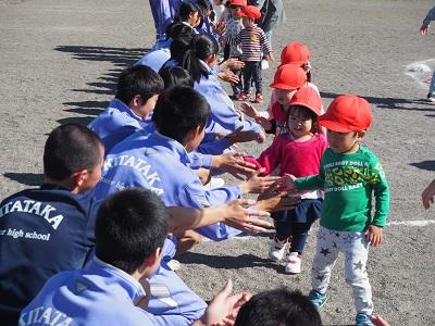 【保育園訪問】家庭科の授業で「保育」を学びます。2年3組が「にじいろ保育園」に訪問し、自分たちで作った遊び道具で園児と一緒に楽しい時間を過ごしました。