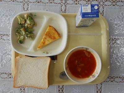 【給食メニュー】ツナサンド、トマトオムレツ、ブラウンシチューです。シチューは濃厚でとてもおいしくいただきました。