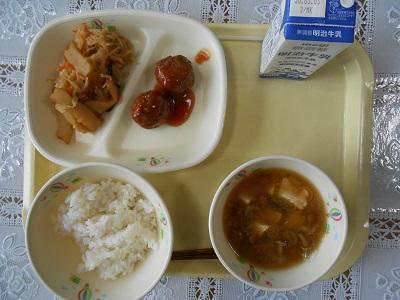 【給食メニュー】野菜肉団子、切り干し大根の煮物、なめこ汁です。