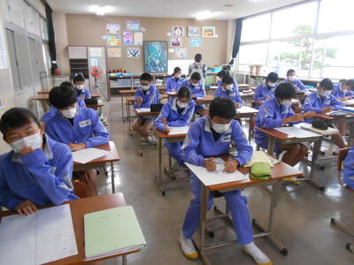 3年1組「確認テスト」3年生は2年生までに学んだ学習内容の確認テストを5教科行いました。いよいよ進路に向けての第一歩です。