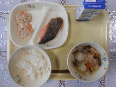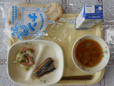 【給食メニュー】牛乳、サンマみりん焼き、大根サラダ、里芋と根菜の味噌汁に本来なら麦ご飯でしたが、都合で3年生はナンに変更になりました。今日のメニューは秋の旬な食材が数多く使われていました。ごちそうさまでした。