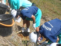 昨年度の場所と違うところ(対岸の山)で、係の人から樹木の植え方を教えてもらいました。今年の樹木はどんぐりの木です。