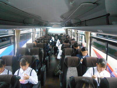 小雨のためバスの中で昼食です。みんな美味しそうに食べていました。