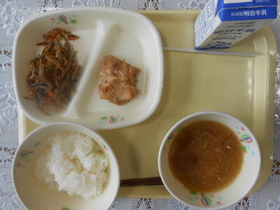 【給食メニュー】ご飯、牛乳、五目煮豆、サバの味噌煮、エノキの味噌汁です。味噌汁にはエノキ、昆布、わかめ、玉ねぎなど具がたくさん入っていてお腹がいっぱいになりました。ごちそうさまでした。