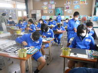 2年1組「美術」デザイン画の彩色です。細かな部分を丁寧に塗っていました。完成が楽しみです。