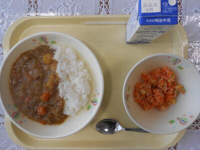【給食メニュー】牛乳、カボチャハンバーグカレー、ごぼうサラダです。明日がハロウィンなのでハロウィンメニューでした。とても美味しくいただきました。ごちそうさまでした。