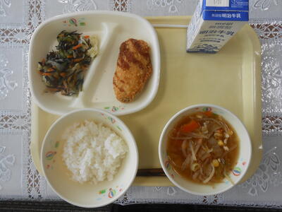 【給食メニュー】ご飯、牛乳、野菜コロッケ、ツナのり酢和え、かんぴょう入りにら卵汁です。ツナのり酢和えは磯の香りがして、ご飯の上にのせて食べました。とても美味しかったです。ごちそうさまでした。