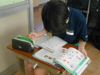 3年2組「英語」本文の内容を理解するために、ペアで読み合っていたり、単語の意味や発音を調べたりしていました。