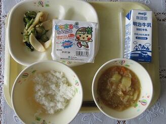 今日の給食は、食パン、ブルーベリージャム、牛乳、オムレツ、フレンチサラダ、ブレディー(トマトシチュー)、カスタードプリンです。高根沢町で生産された物は、にんじん、トマト、きゅうり、玉ねぎ、じゃがいもです。今日もたいへんおいしく頂きました。「プレディー」とは「レソト王国」の料理で、日本のトマトシチューのような料理です。本来はラム肉でつくられますが、給食では鶏肉で代用しています。