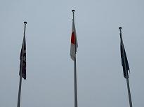 (役員3名で国旗・町旗・校旗を掲揚) (朝、男体山は雲で見えません)