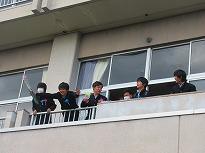 ●大きな花束を持った榎本先生を囲んで、卒業生や親の会のお母さん方も入って国旗掲揚塔前で記念撮影を行いました。のちほど、写真を掲載します。