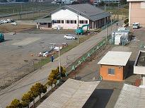 ●2年生の自転車小屋が2つとも撤去され、北側道路に面した白い鉄柵も取り去ってありました。4月10日からの給食運搬車の通路を確保する工事をしています。