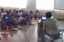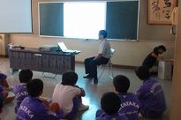 ●④校時は全体会を行い、最初に「照る照る坊主の会」の活動の映像(プロモーションビデオ)が流れ、講師が入場しました。
