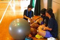 (新人チームに実技指導を)(3年バスケ部がボールのタイヤ圧を調整)