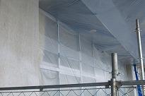 (校舎壁塗装のために窓ガラス免に半透明シートがかけられました)