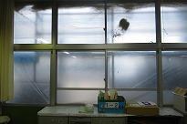 (校舎北側 黒い網シートと窓の目張りで薄暗い廊下)