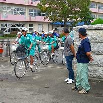 町輪業組合の2名と警察署員1名、町担当2名が来校し、生徒の自転車の点検をしていただきました。