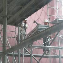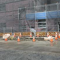 (電柱移動のためのNTT工事) (校舎の囲い 取り外し工事中)