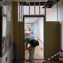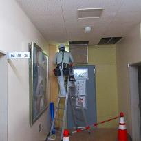 ●工事の場所は、校舎1階の放送室から進路相談室までの工区です。教室窓の強化ガラスへの交換や中会議室は床の研磨とワックスがけ、廊下の床の張り替え等の工事です。