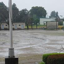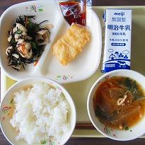 (今日の給食 イカ天丼他) (校庭が小雨でぬかるんでいます)