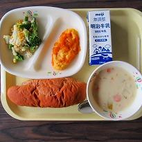 (今日の給食 さつま芋シチュー他) (お昼の空 灰色の雲が)