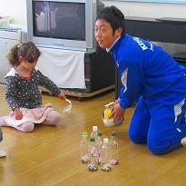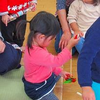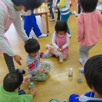 ●作成した「おもちゃ」を紹介すると、1ボーリング(ペットボトル利用した)のピントボール 2落下傘 3型はめパズル 3魚(磁石とクリップで)釣りの釣り竿と魚 4的当て(的入れ) 5パチンコのような道具 6ビー玉が上から下の段に落ちていくおもちゃ などでした。