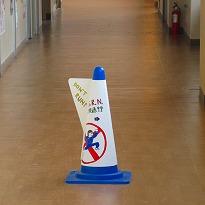 その第1弾が、生徒会が作成した「注意事項が書かれた青いカラーコーン」でした。写真のように、「静かに」「走らない」「右側通行」などと、注意を促す言葉や絵、標識が貼られたカラーコーンでした。各階廊下に置かれました。しかし定着までには、至っていません。