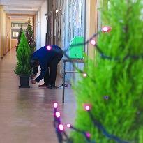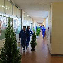 (校舎1階廊下 イルミネーション取り付け作業風景)