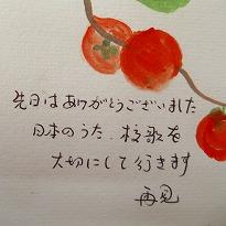 ●柿の実と葉が描かれた絵に、文章は「先日はありがとうございました 日本のうた 校歌を大切にしていきます 再見 ユウ燕 2017,11,22」でした。