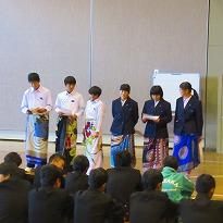 (海外派遣事業報告会 「スル」を巻いて報告する団員たち)