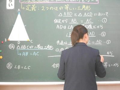 【授業研究】 3校時に2年2組で数学科「二等辺三角形の性質」の公開授業が行われました。底角が等しいことを証明するため、様々な合同条件を導いていました。この授業に数学の先生が3名体制で教えていました。