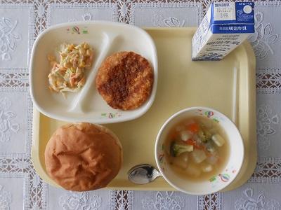 【給食メニュー】 ハムカツ、コールスローサラダ、野菜スープと丸パンです。ハムカツを挟んで食べていました。
