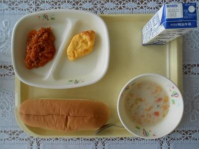 【給食メニュー】 パンにオムレツ、スラッピージョー、冬の野菜のクラムチャウダーです。このクラムチャウダーは本校1年生が考案した「簡単レシピ」の作品です。野菜がたくさん入っていて、とても栄養満点です。