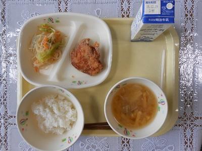 【給食メニュー】 鶏の唐揚げ、春雨サラダ、大根と油揚げの味噌汁です。ちょっと早いクリスマス気分でした。今日のメニューも阿久津小のリクエストメニューでした。