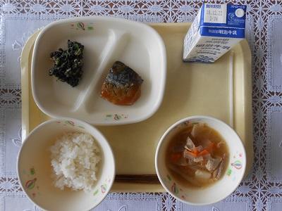 【給食メニュー】 さばの味噌煮、ツナ海苔酢和え、豚汁です。寒いので豚汁は心も身体も温まりました。